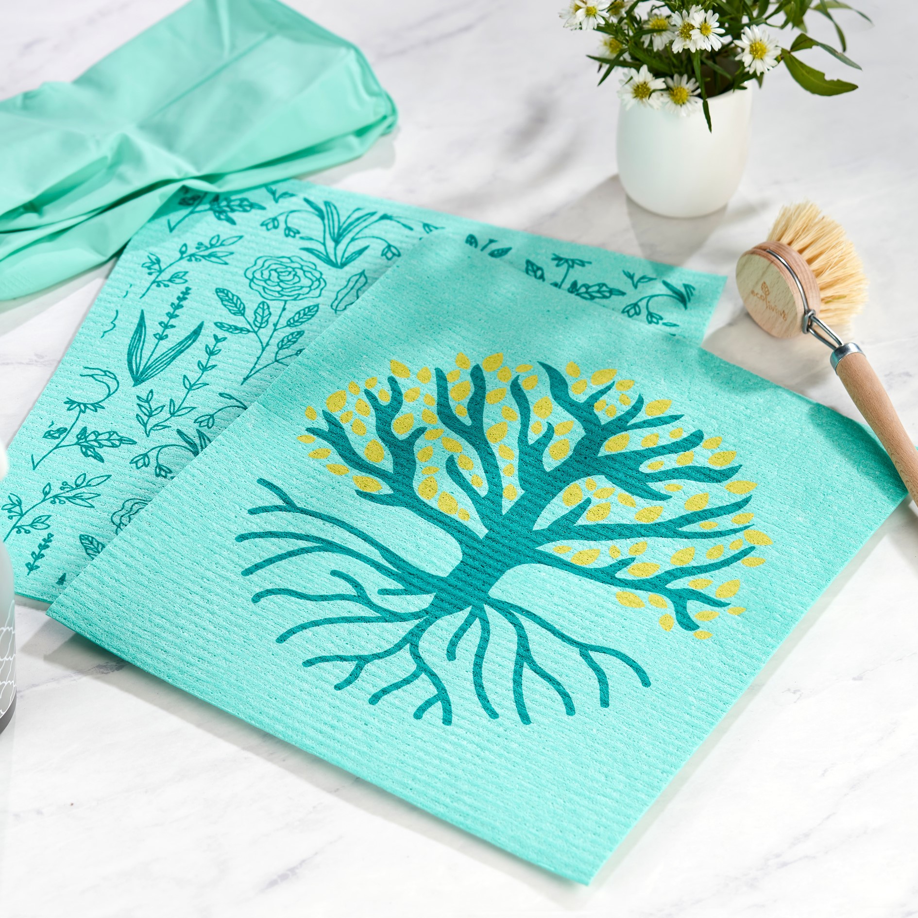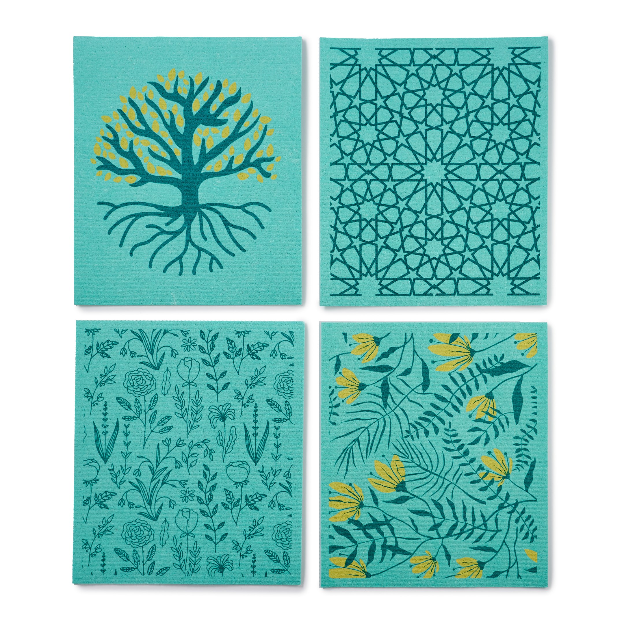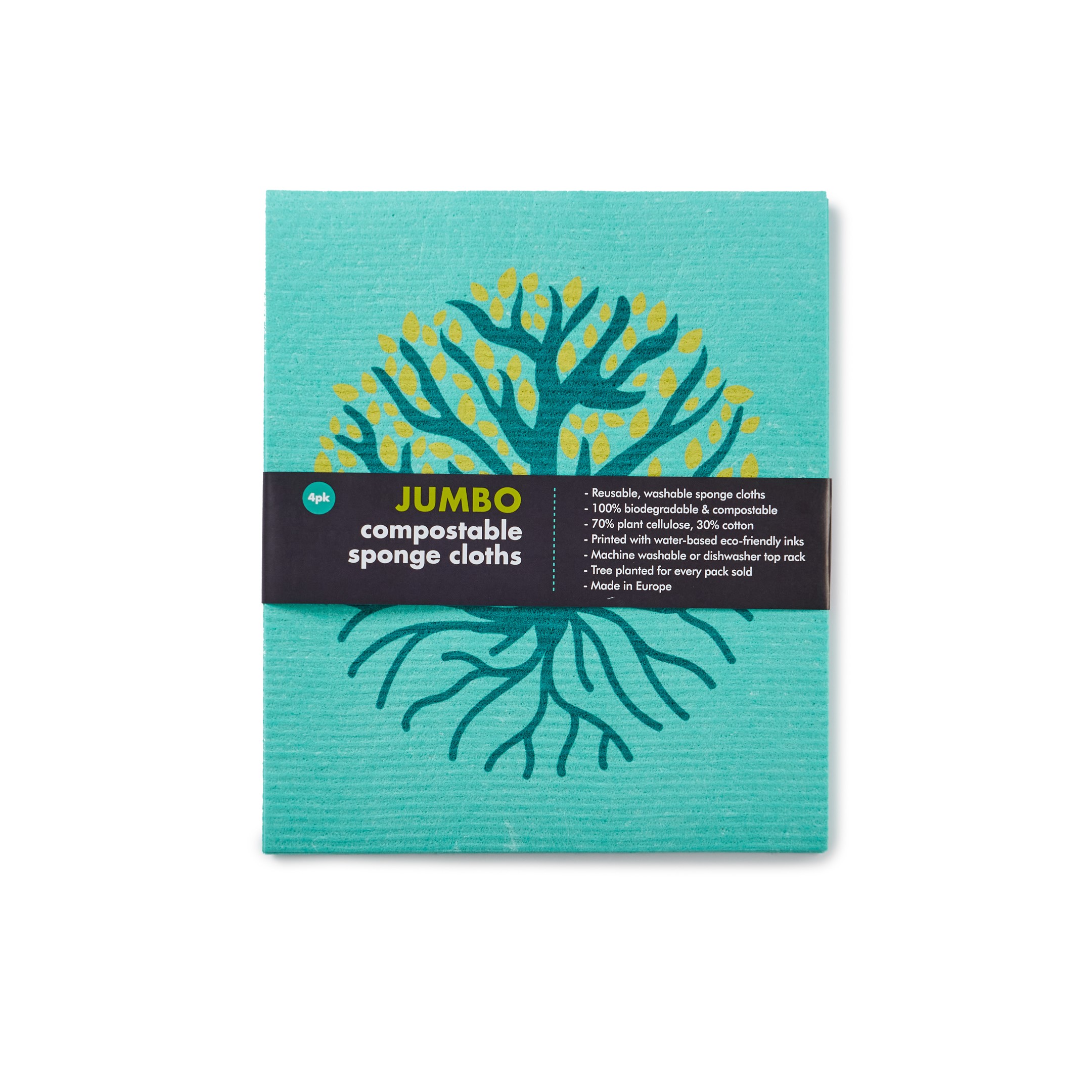 Jumbo size biodegradable sponge cloths. A set of 4 different water-based prints. Made in Europe. 100% plastic-free and made of renewable resources.